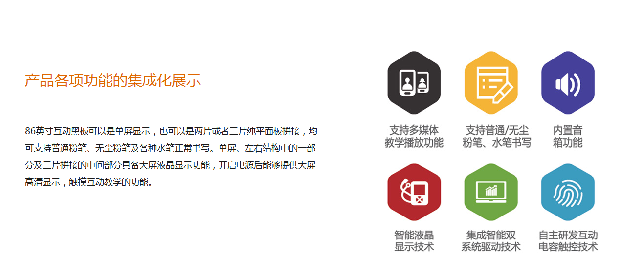86英寸互动黑板是欧帝科技在全国率先推出的大尺寸互动黑板产品,在欧帝科技全尺寸黑板中,86英寸互动黑板最具多样化外观,“既传统 更未来”的全新理念就是有效地将传统黑板和多媒体教学进行有机结合,无缝切换。同一块面积既实现普通黑板的粉笔书写功能,也提供了高清显示和互动触控,包含播放教学课件、视频、图片、动画以及批注等各种丰富的多媒体教学功能。产品将传统黑板与智能高清互动显示功能无缝结合,传统教学与现代科技深度融合,带来更佳的教学体验。